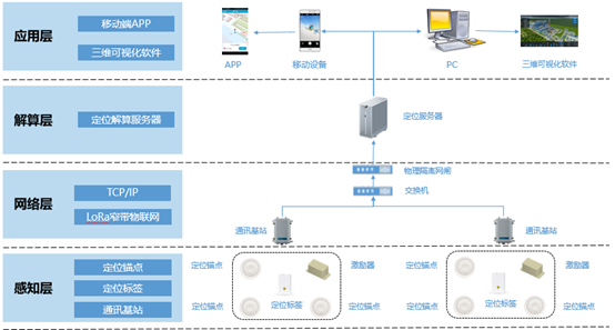 感知層:包括定位標(biāo)簽、定位錨點(diǎn)、激勵(lì)器。定位標(biāo)簽和定位錨點(diǎn)之間通過UWB信道實(shí)時(shí)測距,測距信息通過LoRa 2.4G無線網(wǎng)絡(luò)上傳到通訊基站。
